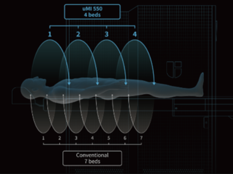 The Long axial 24 cm FOV and high system sensitivity enables whole-body scanning in 4 bed position within 8 minutes